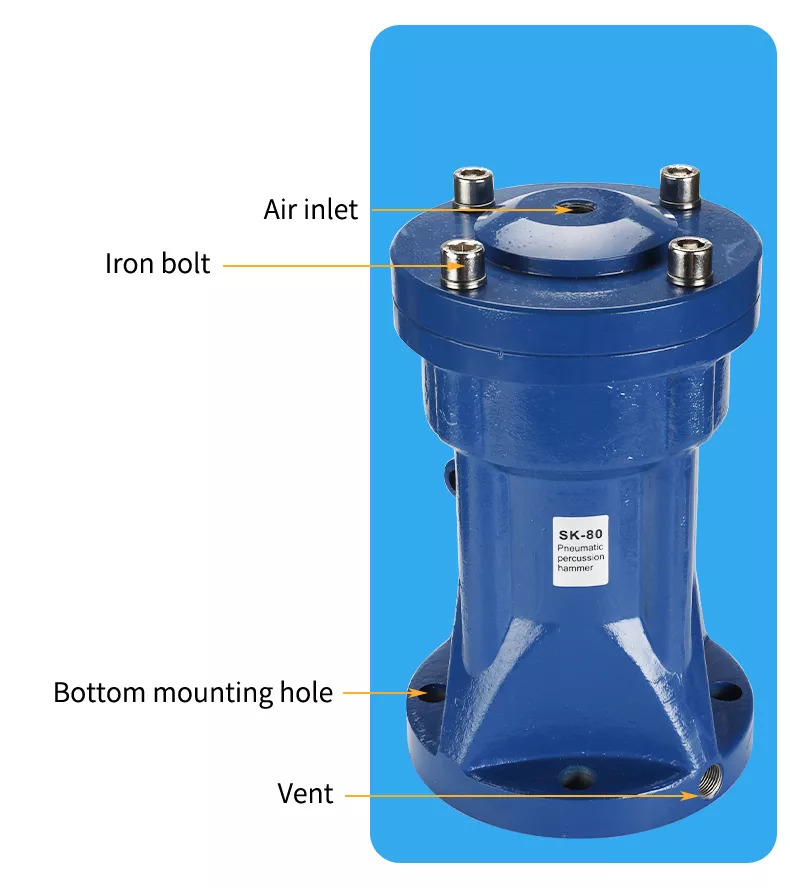 อุปกรณ์สร้างแรงสั่นสะเทือนด้วยลม ช่วยป้องกันฝุ่นผงไม่ให้ไหลหรือเคลื่อนที่เกาะติดผนังท่อไซโลหรือฮอปเปอร์ เป็นอุปกรณ์ที่มีทั้งแบบสั่น (Vibrator) และแบบเคาะ (Knocker) นอกจากนั้นยังมีแบบยิงทลายด้วยลม (Air Cannon) ใช้ในงานผสม งานร่อน หรือคัดแยกขนาดต่างๆ ฯลฯ sk air knocker จะไม่เหมาะกับงานเขย่า เพราะยิ่งเขย่าฝุ่น ผงหรือละอองต่างๆ จะยิ่งจับตัวแน่นกันมากขึ้น